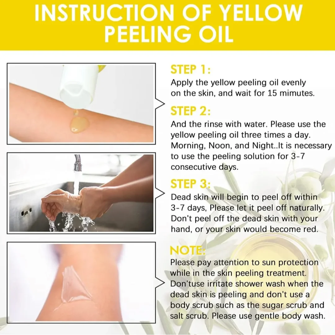 PEELING OIL: This yellow peeling oil is easy and safe to use at home even without any professional assistance. The body exfoliator can be used on various parts of the body.